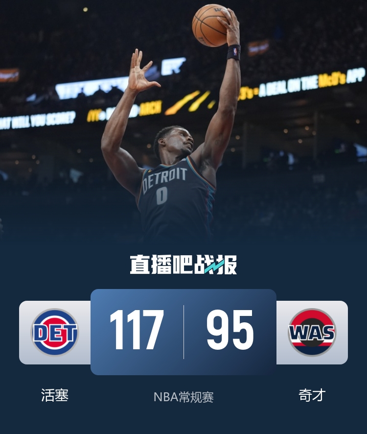 比赛开始,活塞还是反客为主打出13-4开局,卡林顿连续中远投止血,随后活塞又是一波13-0在首节直接领先到21分,次节武克切维奇上来连得13分,奇才发力轰出16-0攻击波重新追至个位数分差,杜伦连续内线吃饼帮助活塞半场守住8分领先。下半场,双方展开拉锯战,杜伦内线继续得分单节上双,但奇才全民皆兵回应,三节活塞还领先10分,末节活塞发力连续反击领先到20分以上,双方开始练兵,最终活塞117-95轻取奇才。