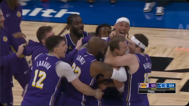 ·比赛最后3秒,湖人边线球,詹姆斯篮下空位被班凯罗盖帽出界,湖人球权,魔术104-102湖人