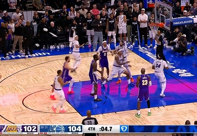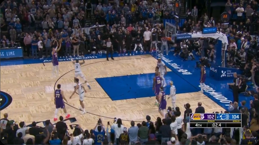 ·比赛最后4秒,魔术边线发球被詹姆斯破坏,魔术发动挑战&失败,湖人拿到球权,魔术104-102湖人