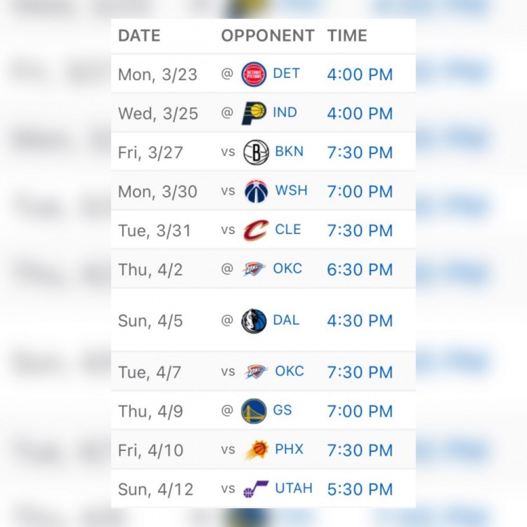最后11场对手依次是:活塞、步行者、篮网、奇才、骑士、雷霆、独行侠、雷霆、勇士、太阳、爵士。