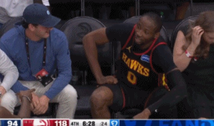 看起来心情还不错!库明加救球摔观众席 坐着休息下等队友来拉