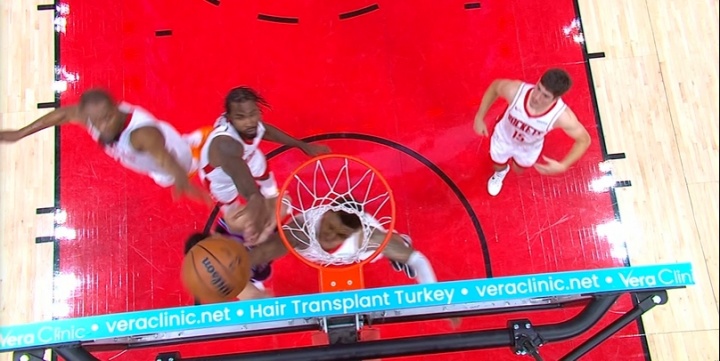 >伊森关键发球失误 火箭丢球 拉松篮下上篮 火箭干扰球 热火领先!