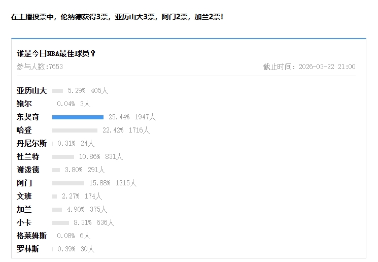 在主播投票中,伦纳德获得3票,亚历山大3票,阿门2票,加兰2票!