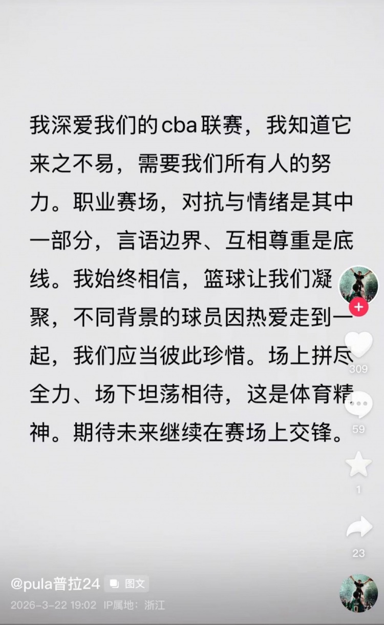 鲁吐布拉也在社媒回应了李祥波的道歉:“我深爱我们的cba联赛,我知道它来之不易,需要我们所有人的努力。职业赛场,对抗与情绪是其中一部分,言语边界、互相尊重是底线。我始终相信,篮球让我们凝聚,不同背景的球员因热爱走到一起,我们应当彼此珍惜。场上拼尽全力、场下坦荡相待,这是体育精神。期待未来继续在赛场上交锋。”