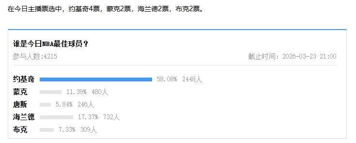 在今日主播票选中,约基奇4票,蒙克2票,海兰德2票,布克2票。