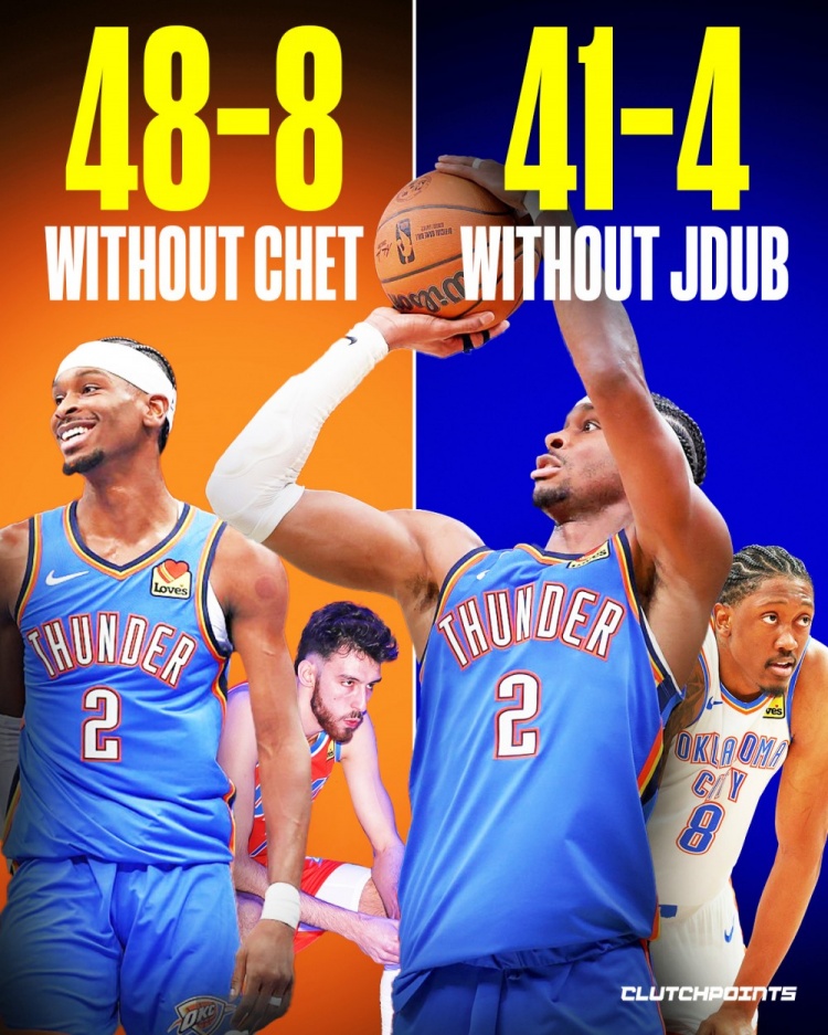 基本盘很稳!2025年以来切特缺阵雷霆战绩48-8 杰伦威缺席41-4