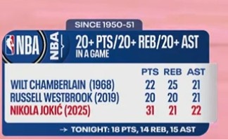 2025年约基奇曾轰下31分21篮板22助攻,本场目前约基奇已砍下18分14篮板15助攻)