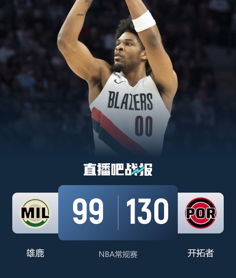 比赛开始,开拓者上来就轰出10-0开局,罗林斯连得7分回应7-0止血,双方连续出现失误,字母哥哥上场很活跃,但开拓者8-0领先到15分,次节开拓者扩大到20分以上领先,格兰特外线连续发炮,雄鹿进攻端没啥办法,半场开拓者领先22分。下半场,克林根里突外投带领开拓者一度领先到30分以上,雄鹿一波10-0紧急止血,但开拓者三节还是领先23分,末节开拓者上来10-0重新领先30分以上,随后换上替补练兵,最终开拓者130-99大胜雄鹿。