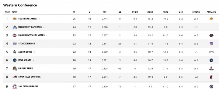 19胜17负的混音目前暂列西部第7位,身后是18胜17负的热火天空力量,以及17胜17负的圣迭戈快船。