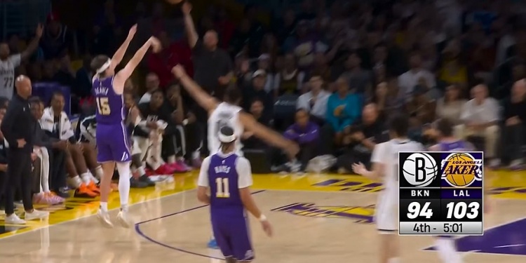>无限猖狂!里夫斯追身三分再度命中 助湖人领先9分打停篮网