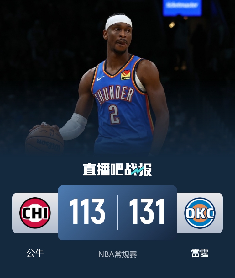 比赛开始,公牛上来连续3记三分打得很主动,华莱士连续抢断反击,雷霆迅速咬住比分,双方展开拉锯战,亚历山大外线始终不开,首节雷霆落后3分,次节双方命中率都有下降,公牛7-0建立主动权,乔接连三分止血,但塞克斯顿和奥科罗接连外线回应,半场公牛领先5分。下半场,公牛始终压着雷霆打,亚历山大进攻端状态还是一般,但公牛最后4分钟一分未得,雷霆一波15-0反超比分,末节公牛继续断电,雷霆7-0扩大领先后继续发力领先到20分以上,随后雷霆开始练兵,最终雷霆131-113大胜公牛。