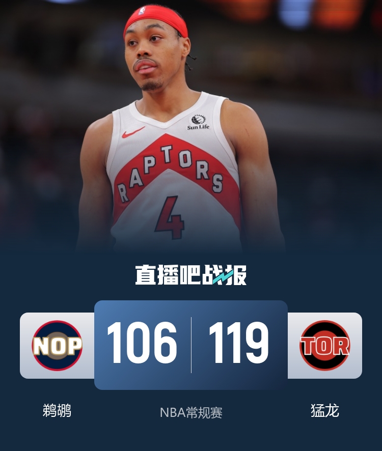 一开场,两队短暂相持,随后猛龙打出7-0的攻击波占据主动,普尔外线开火,鹈鹕板凳发力帮助球队缩小分差,次节鹈鹕突然哑火,猛龙轰出23-6的进攻狂潮打停对手,鹈鹕及时回暖稍稍止血,半场战罢猛龙59-44领先鹈鹕。下半场,双方围绕10分左右分差展开争夺,鹈鹕连投带罚努力追赶,猛龙稳扎稳打保持优势,末节猛龙牢牢占据场上主动,持续输出将分差拉开到20分以上,最终猛龙119-106轻取鹈鹕,主场过关。