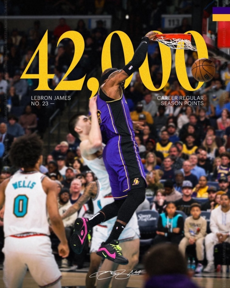 此役,湖人球星詹姆斯通过扣篮拿下生涯常规赛第42000分!