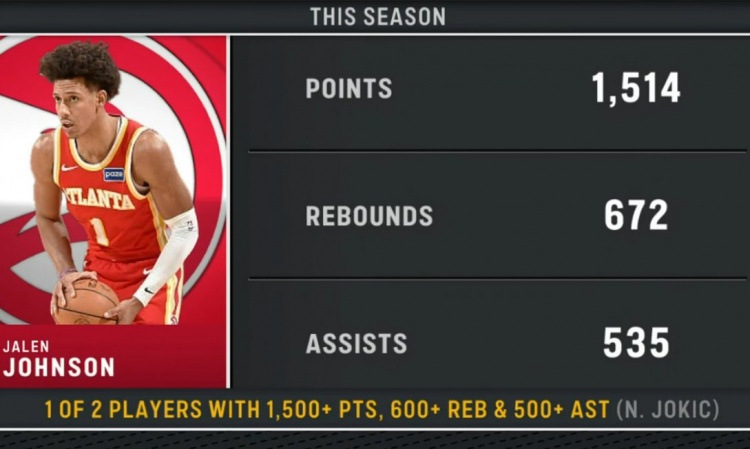 >本赛季仅两人达成至少1500分600板500助:杰伦·约翰逊 约基奇