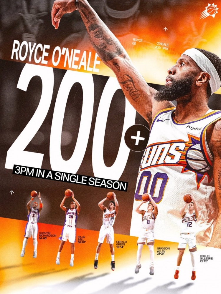 据太阳官方统计,这是奥尼尔赛季第200记三分,是队史第六个达到这一成就的球员。