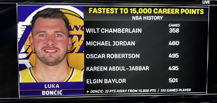 现场给出统计,东契奇距离15000分只差33分,今天是他生涯的第513场比赛。