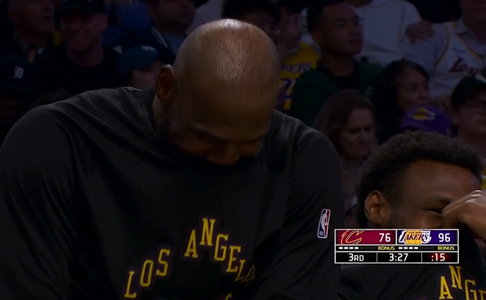 聊啥这么开心!詹姆斯坐在布朗尼旁边说悄悄话 父子俩捂嘴爆笑