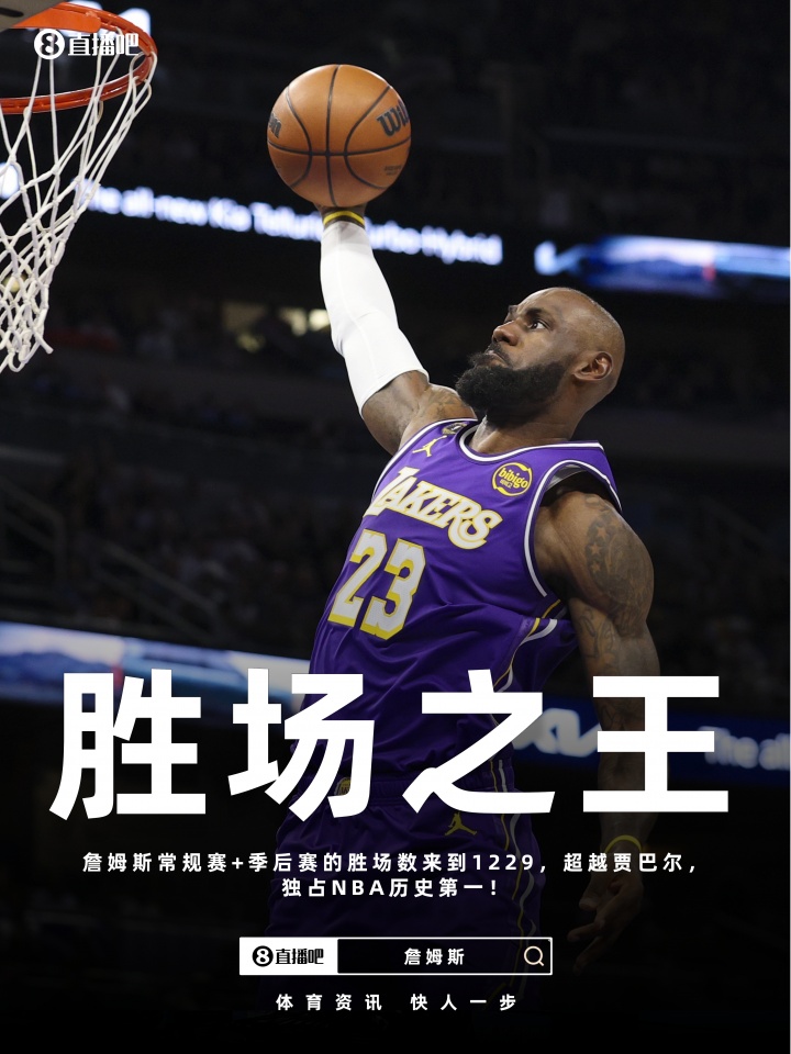 今日赛前,詹姆斯常规赛+季后赛的胜场数为1228场,加上今天的胜利, 詹姆斯常规赛+季后赛胜场数来到1229场(常规赛1045+季后赛184),超越了贾巴尔的1228场(1074+154),独占NBA历史第一!