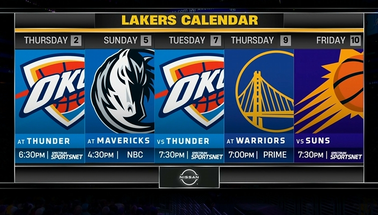 >准备收官!湖人未来5场两战雷霆 客战独行侠&勇士 主场战太阳