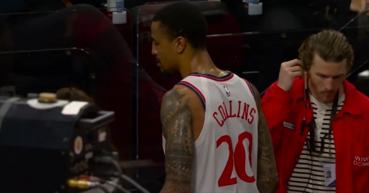 >科林斯抢篮板和大洛撞到一起 膝盖有点受伤回更衣室了