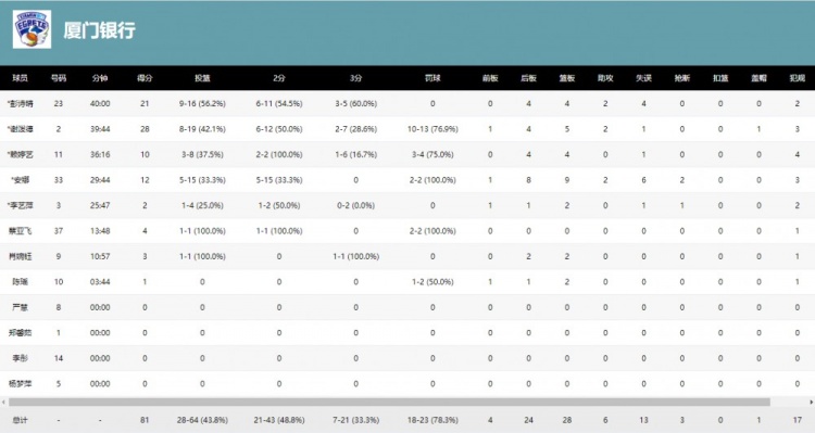 球队方面,厦门银行整体投篮命中率43.8%和三分命中率33.3%,还高于石家庄英励的37.5%和30.4%;而篮板方面是厦门银行的主要输球原因,总篮板数28-50比对手少22个,前场篮板更是4-20少对手16个;助攻数6-17比对手少了11个。厦门银行对石家庄英励外援安妮莉的防守做得不好,她里突外投砍下35分18板,作为前锋抢下9个前场板。球员方面,彭诗晴再次打满全场,拿到21分4板2助;谢泼德手感回暖砍下28分5板2助;安娜手感一般拿到12分9板2助;赖婷艺也上双拿到10分。4月2日(周四),双方将继续在石家庄进行季后赛首轮的第三场较量,也将是厦门银行女篮的背水一战。