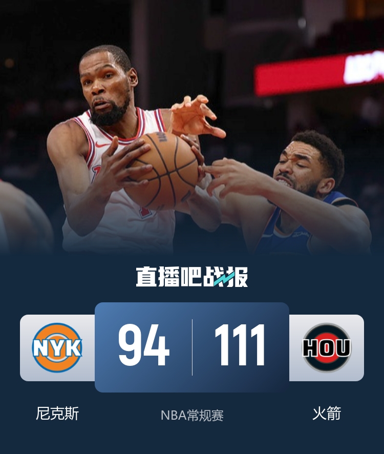 开场后杜兰特就强势发挥带领火箭打出14-1的开局,此后尼克斯虽然稍微找到些手感,但伊森也状态火热接连砍分帮助火箭继续保持巨大优势。第二节尼克斯轮换阵容上来就掀起反扑一度追到只差4分,随后火箭内外开花重新掌控住局面将比分拉开,谢泼德也是接连砍分,半场过后火箭依旧手握13分优势。易边再战,尼克斯继续努力追分,但杜兰特和史密斯两记三分浇灭尼克斯反扑势头,随后火箭经过一阵拉锯后将分差拉大到20分。最后一节唐斯内突外投为尼克斯努力追分,但球队整体未能形成连续攻势,火箭始终保持两位数优势,最终火箭111-94轻取尼克斯收获3连胜,尼克斯遭遇3连败。