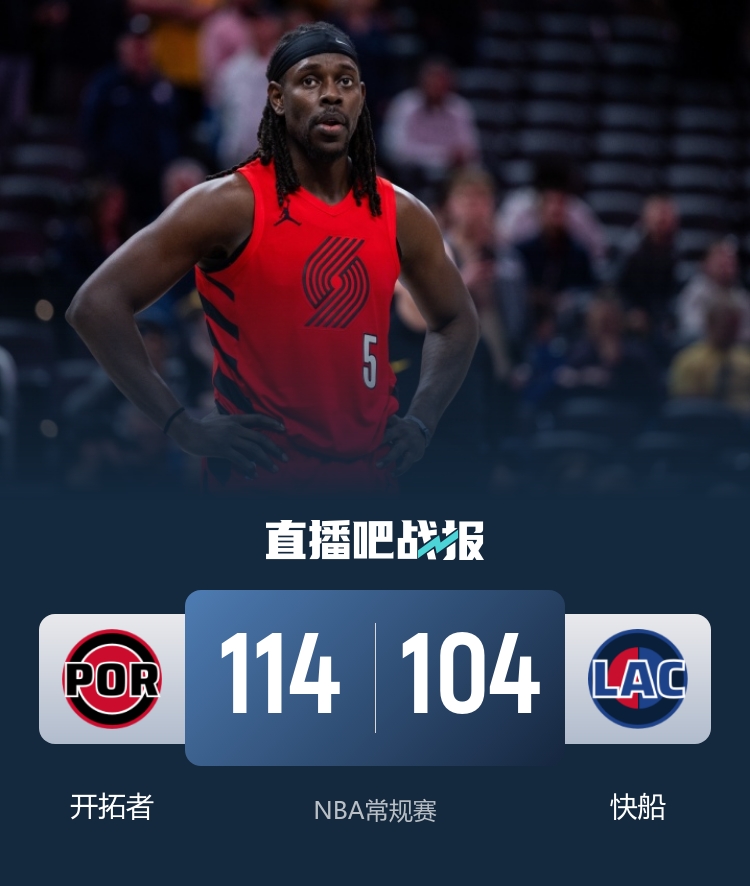 此役一上来双方迅速进入状态,霍勒迪手感滚烫连中三分,快船同样在外线强势回应,两队你来我往互不相让,首节结束时开拓者领先3分,次节回来,开拓者延续火力气势如虹,快船进攻断电单节仅有15分进账,半场战罢,开拓者确立16分优势。短暂休整后快船找回进攻感觉,伦纳德连造杀伤率队追分,但霍勒迪联手阿夫迪亚总能回应,三节结束后开拓者依然领先17分,末节上来,快船没有放弃继续追分,但开拓者稳扎稳打牢牢占优,最终开拓者114-104力克快船终结对手5连胜。