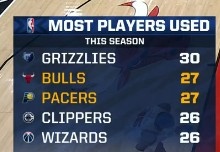 >本季使用球员最多球队:灰熊30人第1 公牛步行者第2 快船奇才第4