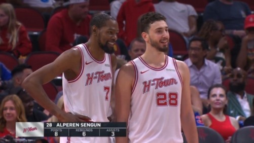>气氛很对!杜兰特和申京在场上微笑交流 随后马上投入防守
