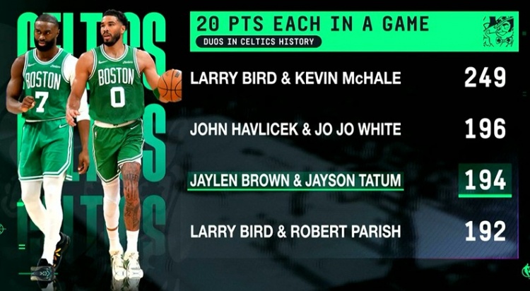 这是双探花第194场同砍20+,队史第三,距离第二的哈弗里切克和乔乔·怀特组合只差2场,队史第一的是伯德和麦克海尔的249场。
