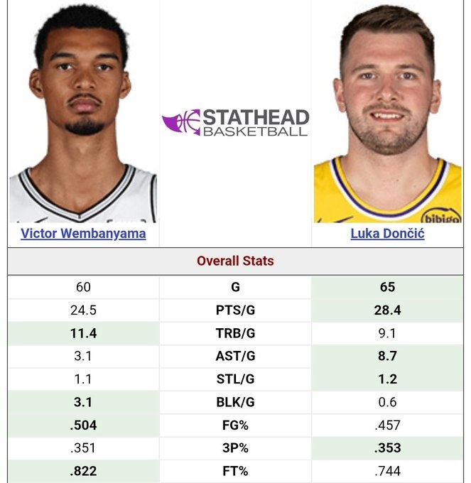 >22岁文班场均24.5+11.4+3.1帽 22岁东契奇28.4+9.1+8.7+MVP第5