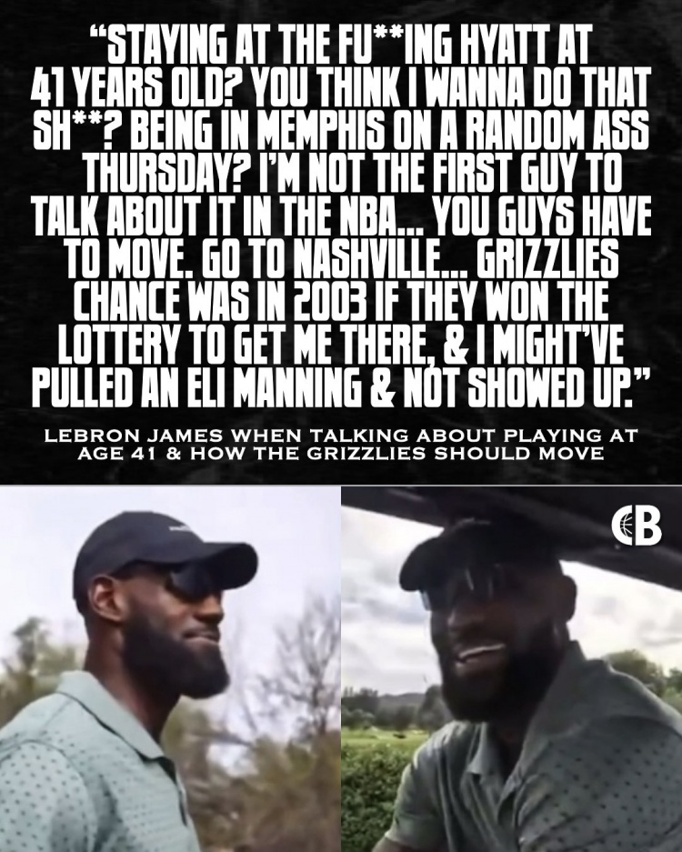 詹姆斯说道:“我都41岁了,你还要我去住那该死的凯悦酒店?我不是第一个这么说的人,但你们得搬走了,就搬去纳什维尔,那里有范德比尔特大学,还有那该死的纳斯卡,球馆,以及冰球队。能让我加盟灰熊的机会,可能就是他们在2003年的选秀大会上赢得状元签了。不过如果我要是被他们选中的话,我可能也会像伊莱·曼宁(NFL传奇四分卫)那样,直接不来孟菲斯报道。”