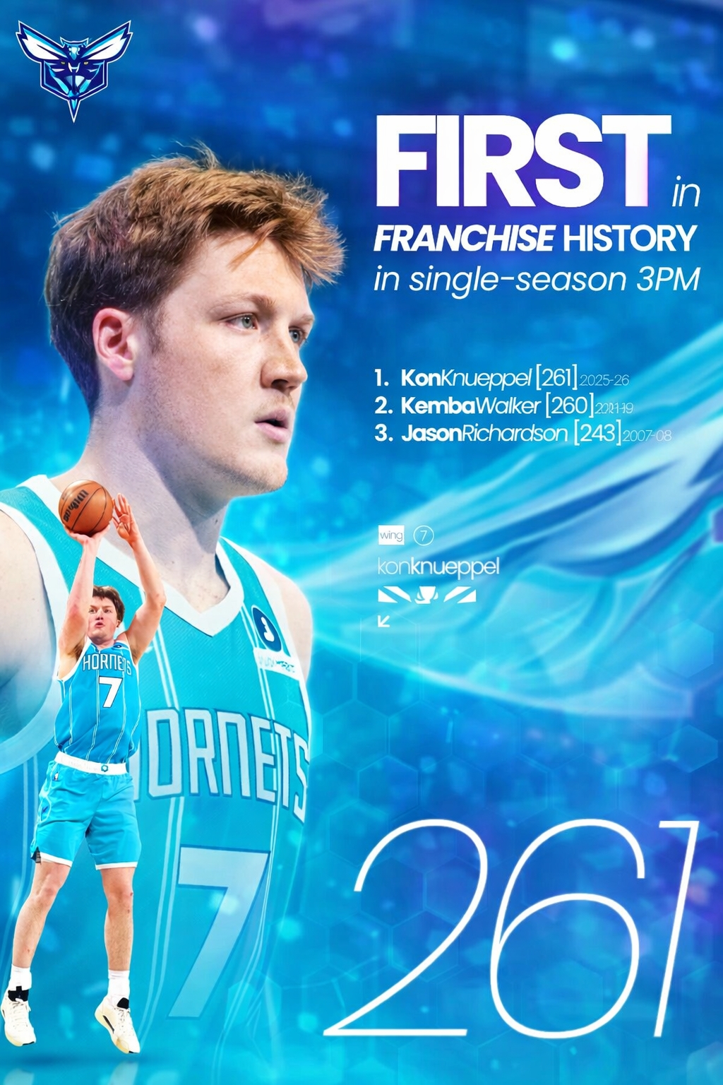 比赛进行到第四节,黄蜂4号秀克尼佩尔投中此役第4记三分,赛季至今三分命中数来到261记,创下黄蜂队史单赛季新纪录(原纪录保持者——肯巴·沃克,260记三分,2018-19赛季)。