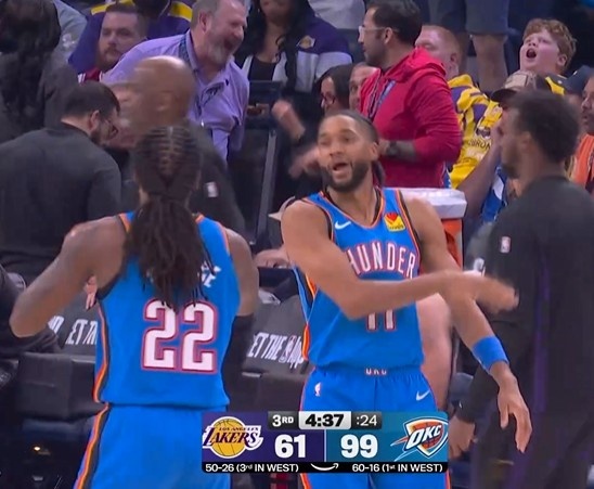 >狂轰滥炸!以赛亚·乔帽子戏法三分3连击 雷霆领先湖人38分
