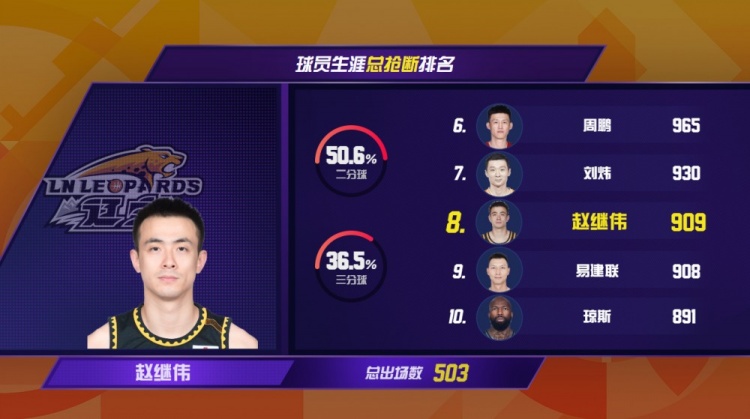 此役过后,赵继伟CBA生涯总抢断数达到909次,超越易建联来到CBA历史抢断榜第八位。