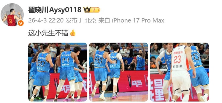 赛后,北京男篮队长翟晓川晒出与张鹏珲的庆祝图并写道:“这小先生不错👍”