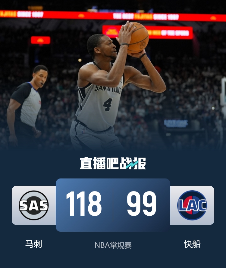 直播吧4月3日讯 NBA常规赛,马刺客场挑战快船。马刺10连胜,以58胜18负高居西部第2,快船39胜37负西部第8。文班亚马本场缺阵。