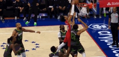 >平地起惊雷!恩比德三分球不中 巴洛冲筐隔着李凯尔补扣砸进