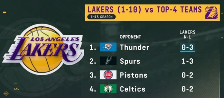 >打不了强队!湖人本季打联盟前四:0-3雷霆1-3马刺0-2活塞0-2绿军