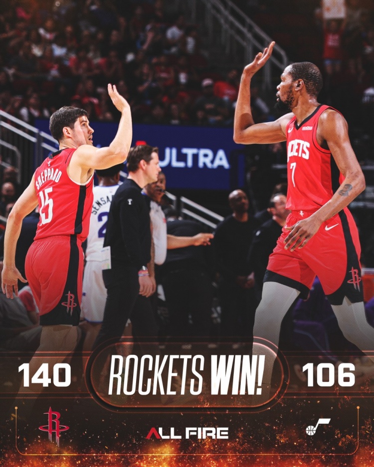 赛后火箭官方晒出本场赢球海报,杜兰特和谢泼德登上封面。