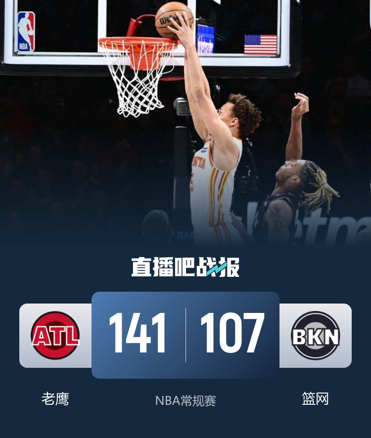 比赛开始,老鹰上来就全面开花轰出25-8不错开局,篮网全民皆兵追分,最后2分钟篮网8-0追至差10分,次节马拉奇·史密斯接连三分继续追近比分,但库明加三分后老鹰一波9-0重新领先双位数,随后双方展开拉锯战,半场老鹰领先16分。下半场,双方围绕着十几分领先继续拉锯战,老鹰首发五虎轮番发力,三节老鹰还领先13分,末节老鹰接连外线发炮拉开20分以上领先,随后双方很快练兵,最终老鹰141-107轻取篮网。