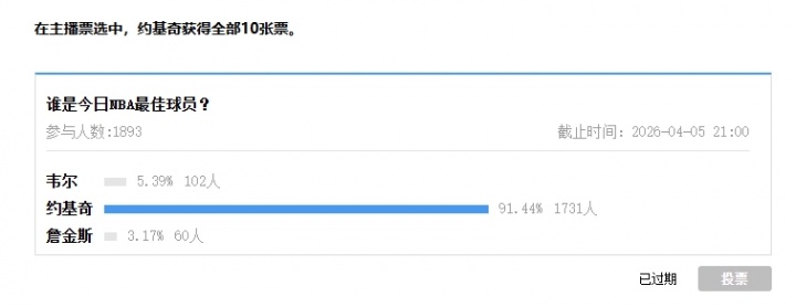 结果显示,约基奇无悬念当选今日NBA最佳球员!
