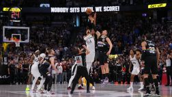 比赛开始,双方迅速进入状态展现出很强的求胜欲望,瓦塞尔外线连中3记三分,约基奇连续强打追分,文班下场后马刺全民皆兵,掘金外线也能回应,首节马刺领先7分,次节马刺上来8-0领先到双位数,瓦兰连续内线止血,随后文班和约基奇接连罚球,半场马刺继续领先7分。下半场,约基奇联手戈登带队追分,但卡斯尔接连杀内线强势回应,双方围绕10分左右分差拉锯,斯特劳瑟和布劳恩又接连三分追到差4分,末节文班亚马带队重新拉开双位数领先,掘金8-0迅速止血回应,随后掘金持续咬住比分,穆雷三分一度反超,瓦塞尔三罚加上篮止血回应,戈登暴扣空篮追平后文班亚马绝杀中投不中,双方进入加时。加时赛,双方继续咬住比分,约基奇关键时刻顶着文班亚马高难度中投加抛投,文班亚马三分不中,最终掘金加时136-134险胜马刺。