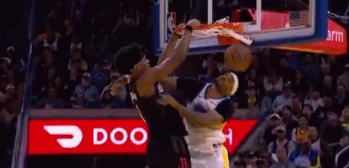 >弹速惊人!阿门切入接球直接暴起双手隔扣小佩顿打成2+1