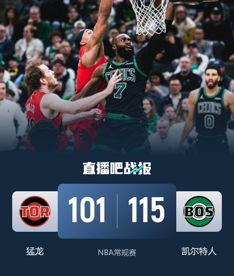 比赛开始,凯尔特人利用主场优势率先发力打出10-2的开局,猛龙展开反击,内外开花不断迫近比分,凯尔特人命中率下降,猛龙打出12-4的攻势抹平分差,次节猛龙率先发力轰出10-0的攻击波,凯尔特人回敬8-0的小高潮,半场凯尔特人54-46领先猛龙。易边再战,双方展开对攻,猛龙火力更凶,里突外投继续迫近比分,末节猛龙突然哑火,双探花联手带队将分差拉开到15分以上杀死比赛。最终,凯尔特人115-101击退猛龙,主场过关。