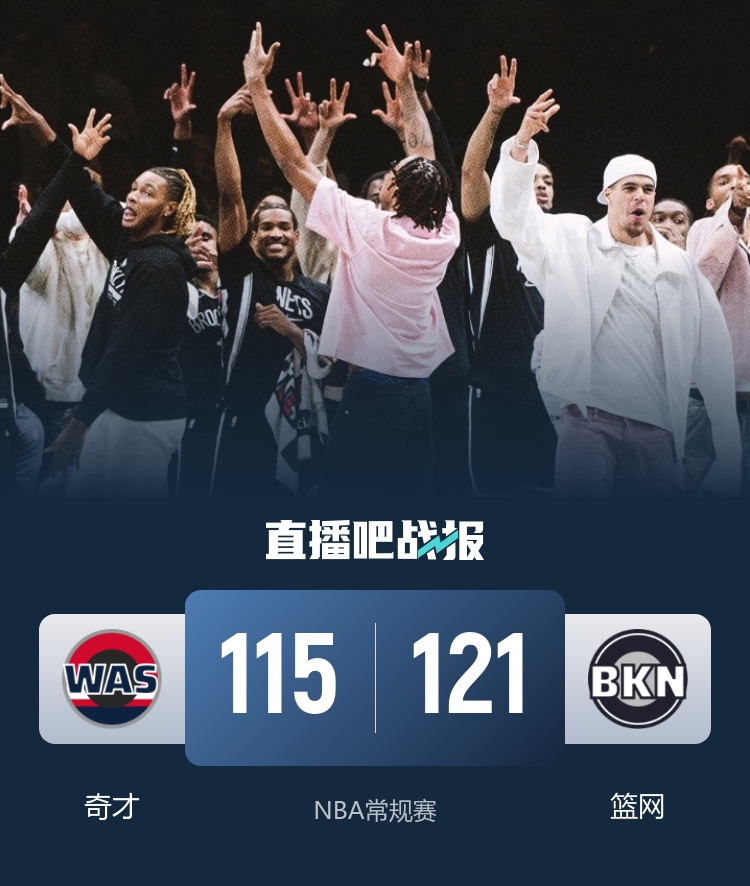 篮网(19-59):特拉奥雷23分2板7助、威尔逊19分5板4助、利德尔15分5板2助2帽、米诺特15分1板1助2断3帽、鲍威尔13分1板2助3断、阿巴基12分4板2助、约翰逊9分5板1助2帽、艾蒂安9分4助、斯科特4分8板3助2帽、史密斯2分4板3助