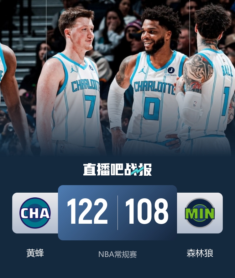 开场后黄蜂率先打开局面,森林狼连续命中三分将比分追上,两队经过短暂僵持后黄蜂在鲍尔带领下打出攻势建立领先。第二节上来森林狼掀起反扑,并且一度打出11-0的高潮将比分反超,鲍尔重新登场后延续手感为黄蜂紧咬比分,海兰德和兰德尔轮番回应,海兰德还投进压哨三分,半场过后森林狼反超5分。易边再战,鲍尔和布里奇斯外线连飚三分帮黄蜂夺回领先,森林狼进攻迟迟未能打开局面,靠兰德尔强攻艰难拿分,森林狼一度迫近比分,但黄蜂又是三记三分稳住局面。第四节上来黄蜂延续攻势直接打停森林狼,但暂停过后森林狼表现依旧不理想,鲍尔一记三分将分差拉大到20分,森林狼追分无望撤下主力,最终黄蜂122-108轻松击败森林狼取得4连胜,森林狼遭遇3连败。