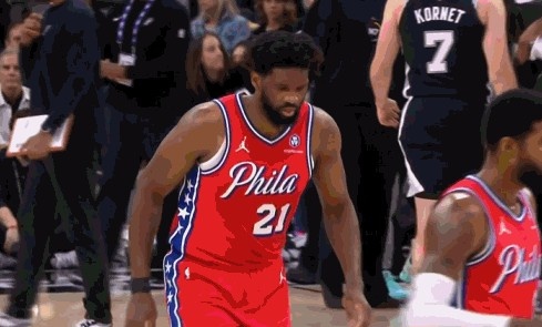 >没好利索?恩比德中投命中 之后摇头并不断活动膝盖