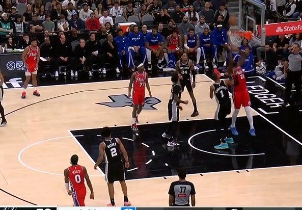 >还是得逞了!恩比德合球造犯规不成 自抛自扣最终获得罚球