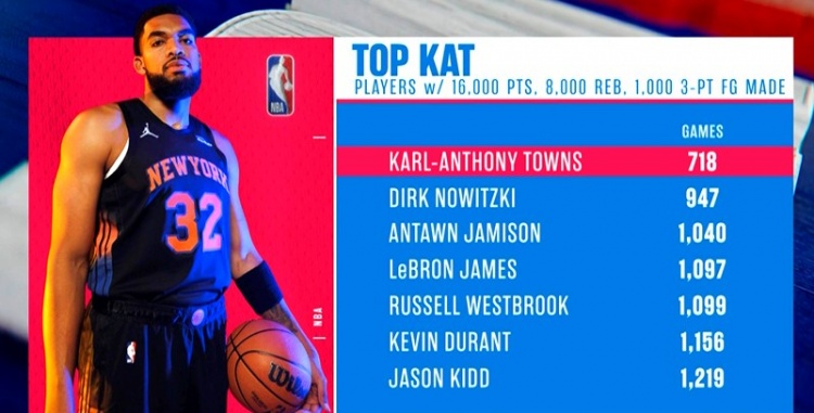 在今天的战胜老鹰的比赛中,尼克斯中锋唐斯达成生涯16000分8000篮板1000三分的成就,是历史第七个达成这一成就的球员。